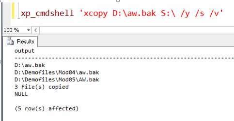 xp_cmdshell 'xcopy D:\aw.bak S:\ /y /s /v'
